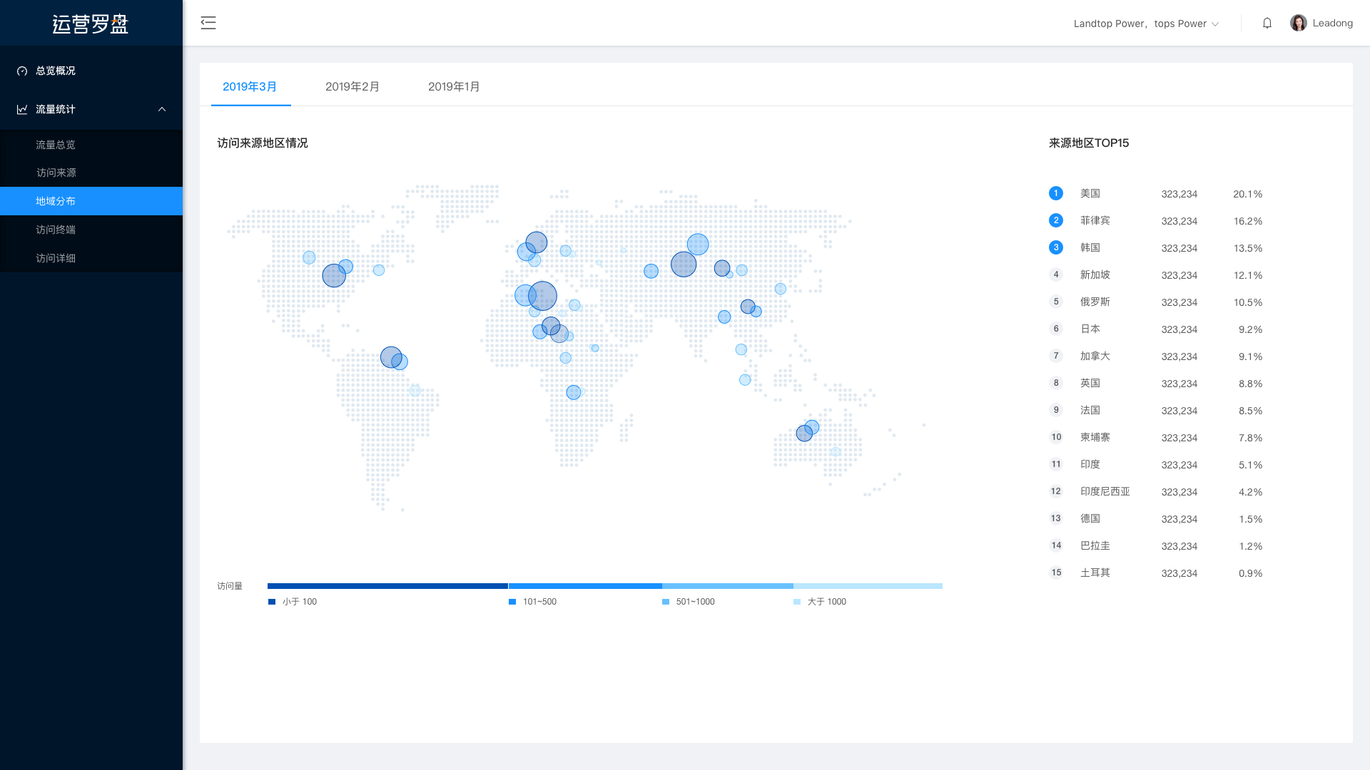 流量总览:从网站近一个月的总浏览量、独立访客数、独立IP、询盘转化率等方面,反映出网站这一段时间的运营数据,提高了运营人员的工作效率。