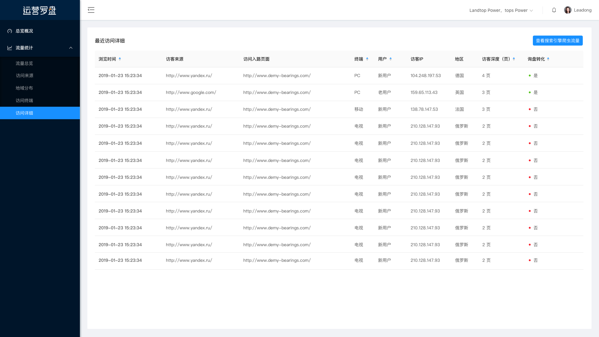 访问详细:展示出访客到达网站的页面,让运营人员了解到来源道。