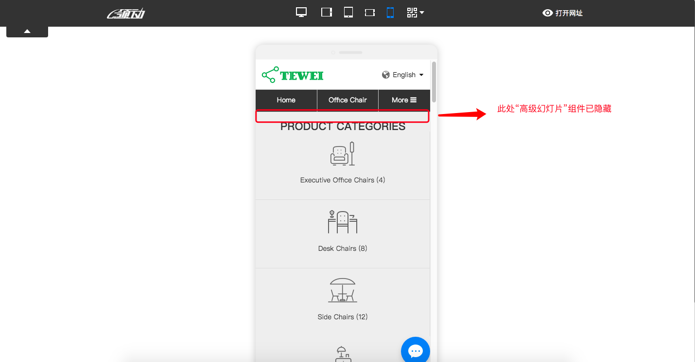 (3)点击“编辑”按钮进行该组件编辑,可修改该组件在移动端的“显示/隐藏”状态(此处以隐藏“高级幻灯片”组件为例),如下图所示: