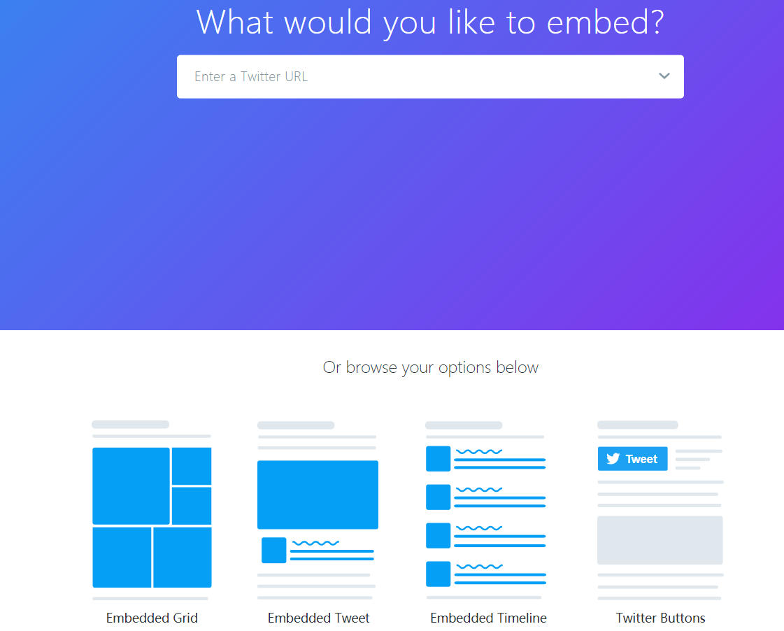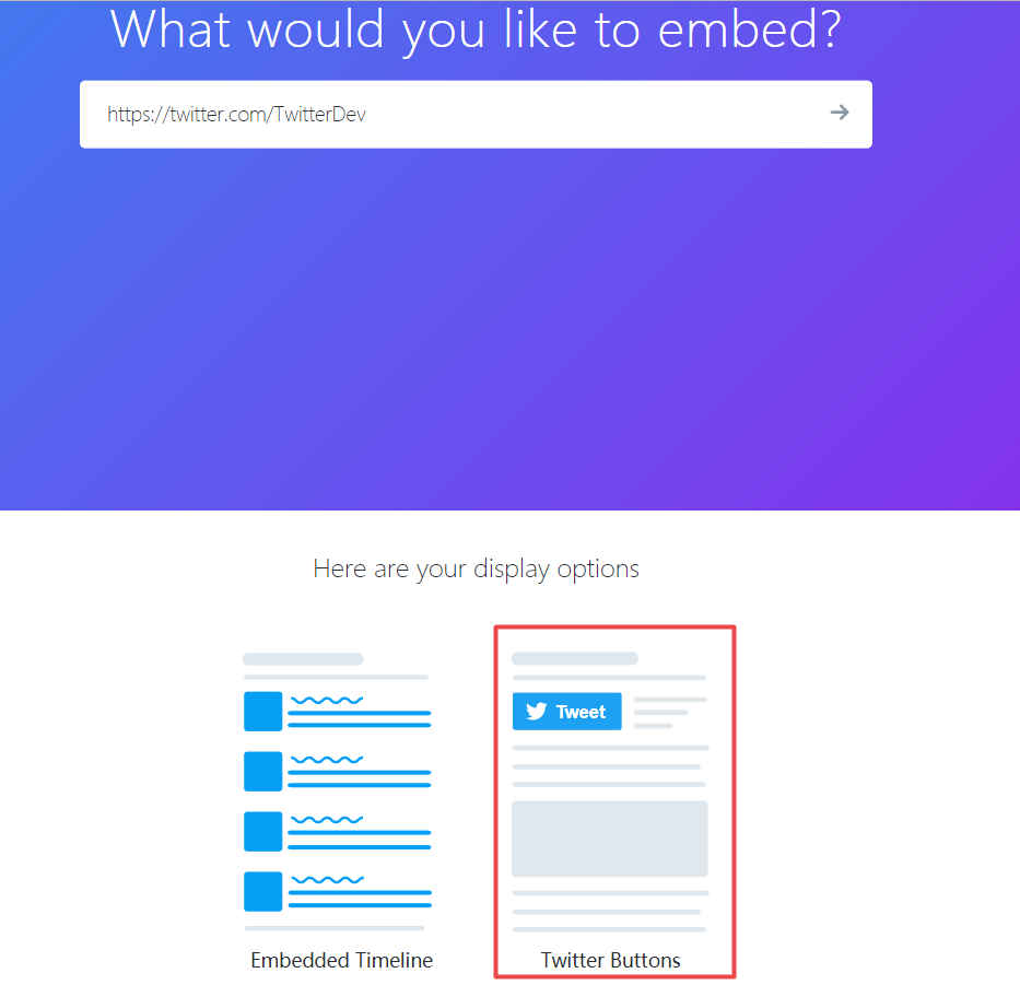 Twitter展示代码分为三种:嵌入推文、嵌入时间线、嵌入“分享”按钮、嵌入“关注”按钮