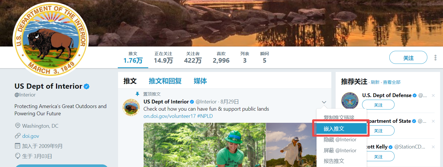 嵌入推文操作非常简单,访问任意的主页,点击要嵌入的推文右上角箭头,选择下拉中的“嵌入推文”按钮,将得到的代码复制到组件输入框中即可。