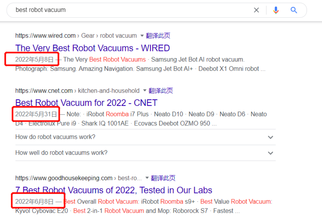 搜索“best robot vacuum(最佳机器人吸尘器)”,似乎所有的文章都在上个月或者上上个月(截至2022年7月)更新过。