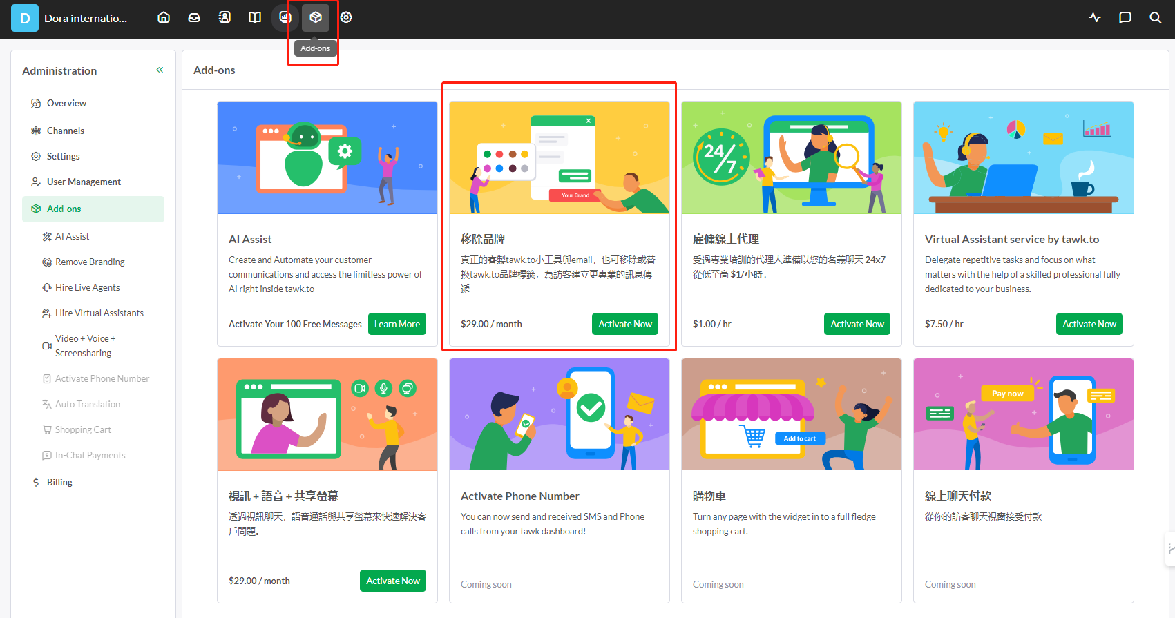 首先登陆您的tawkto账号,之后可通过点击“Add ons”购买“移除品牌”的服务。
