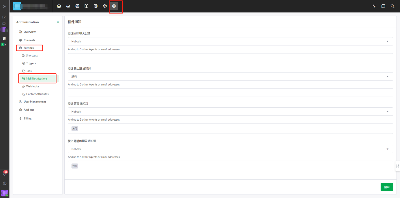 可以选择发送聊天记录/新留言/新工单/错过的聊天信息,到某个人的邮箱,此处的邮箱可以设置为管理员或每个人或特定某个人的邮箱
