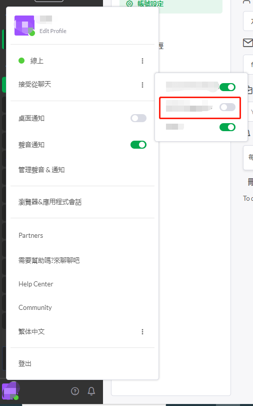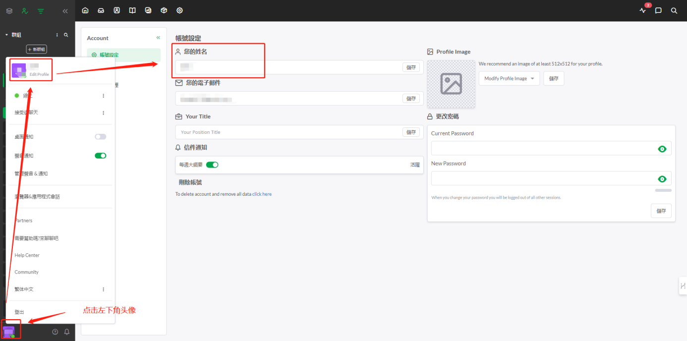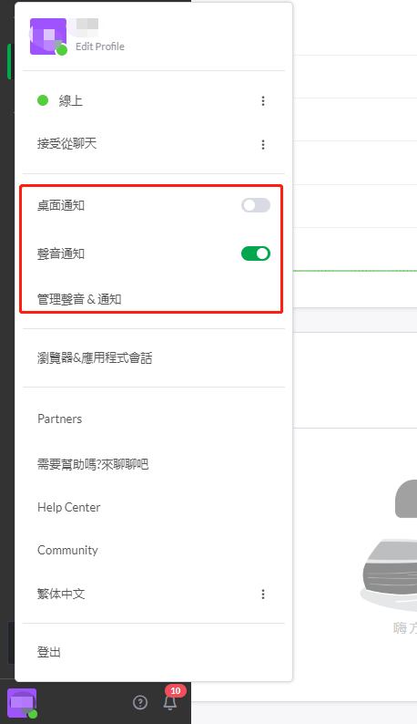 可设置在线状态,是否接受聊天、桌面通知、声音通知、修改后台使用语言(可修改为繁体中文)