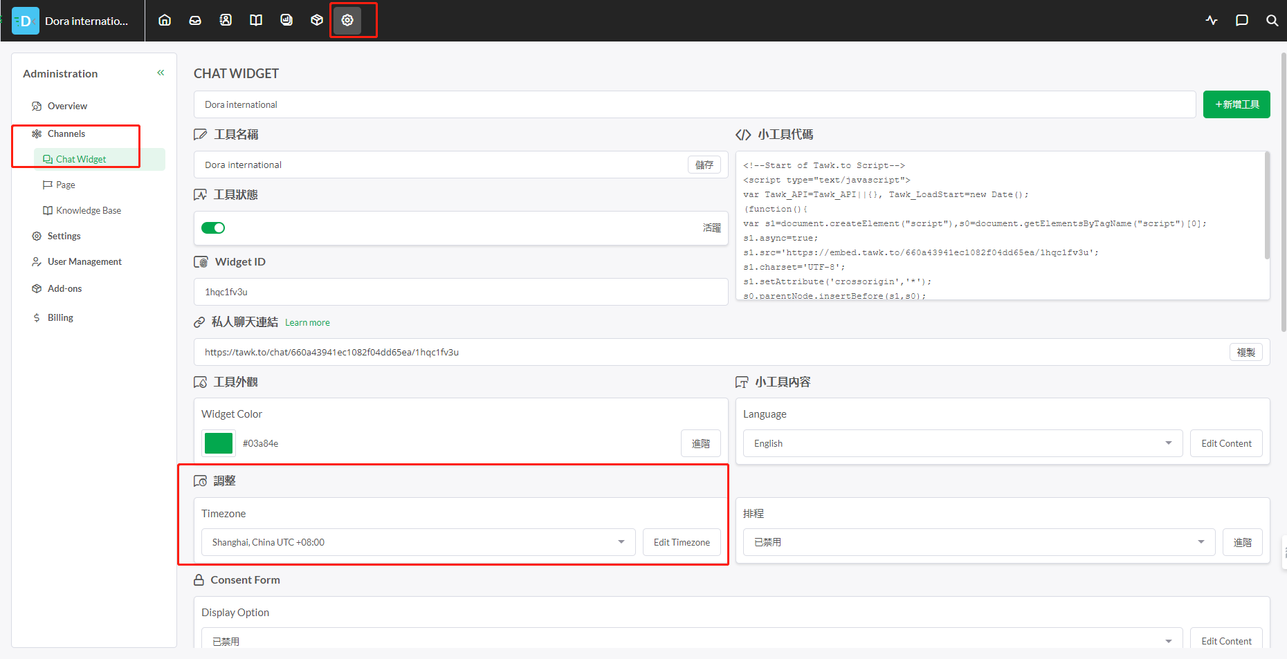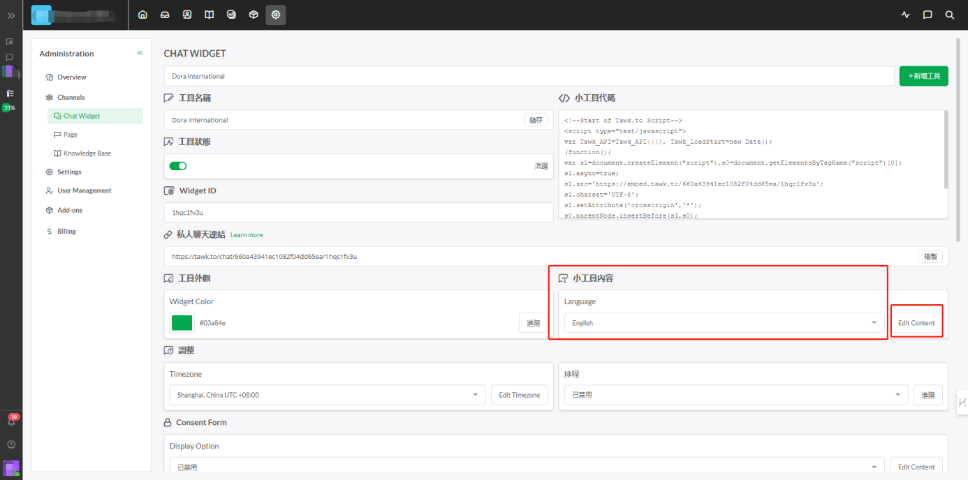 首先登陆您的Tawk.to账号,之后点击“管理”→“Chat Widget”→“工具外观”