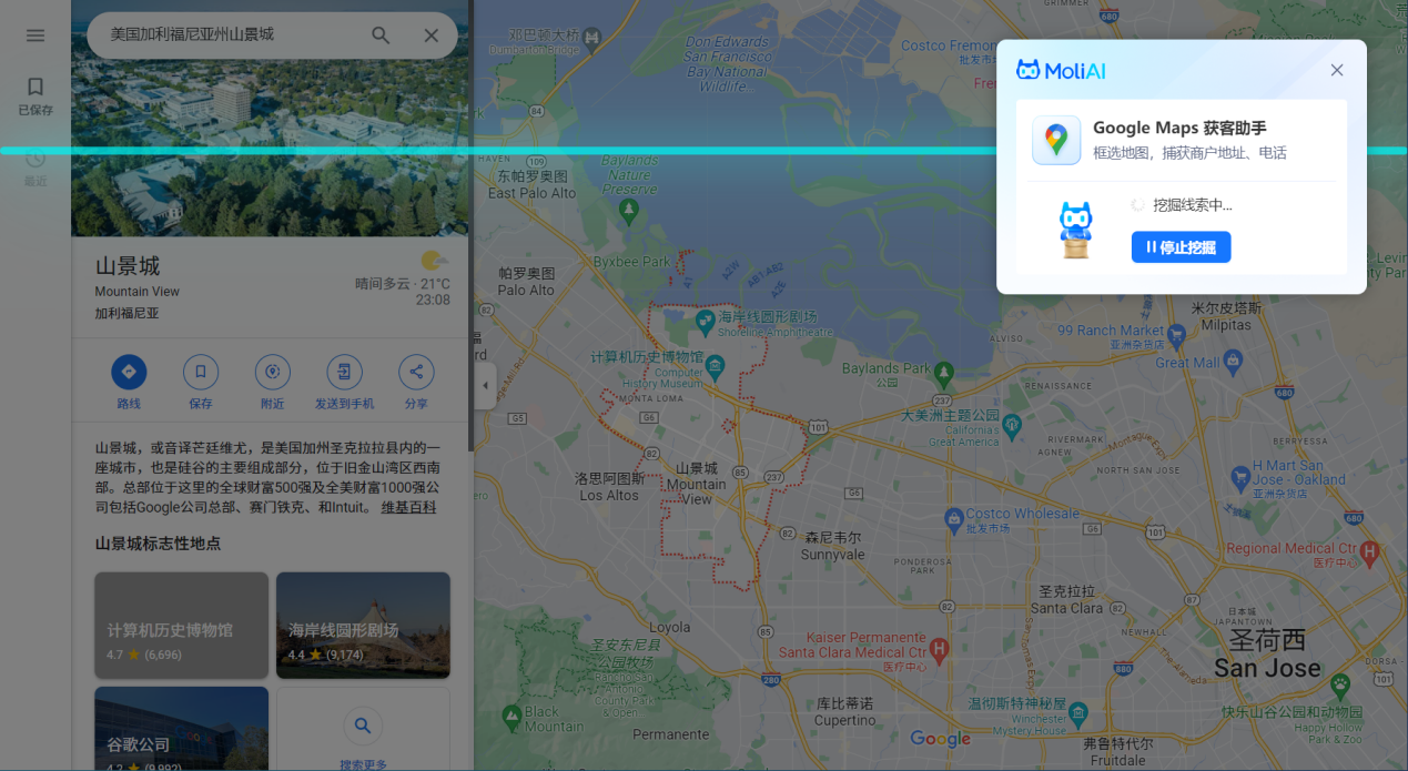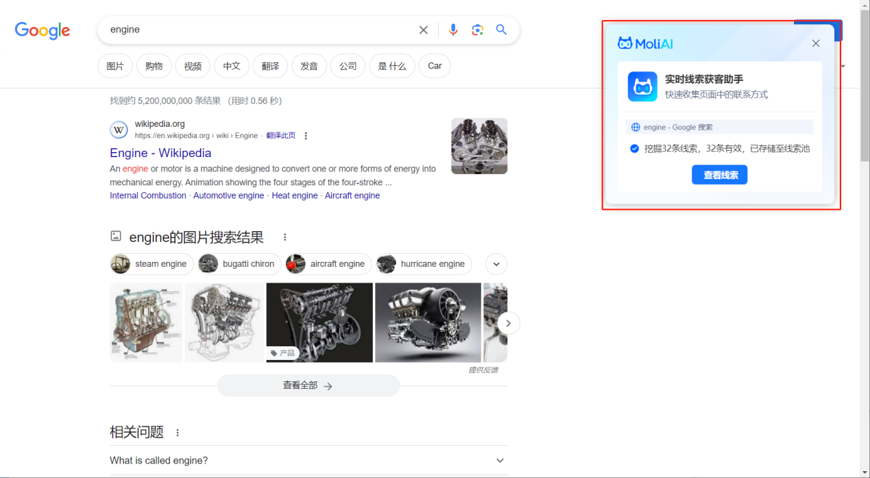 (2)使用实时线索获客助手(以Google的搜索结果页面为例),点击”实时线索获客助手“选项,会为您自动获取当前页面的联系信息,如下图所示: