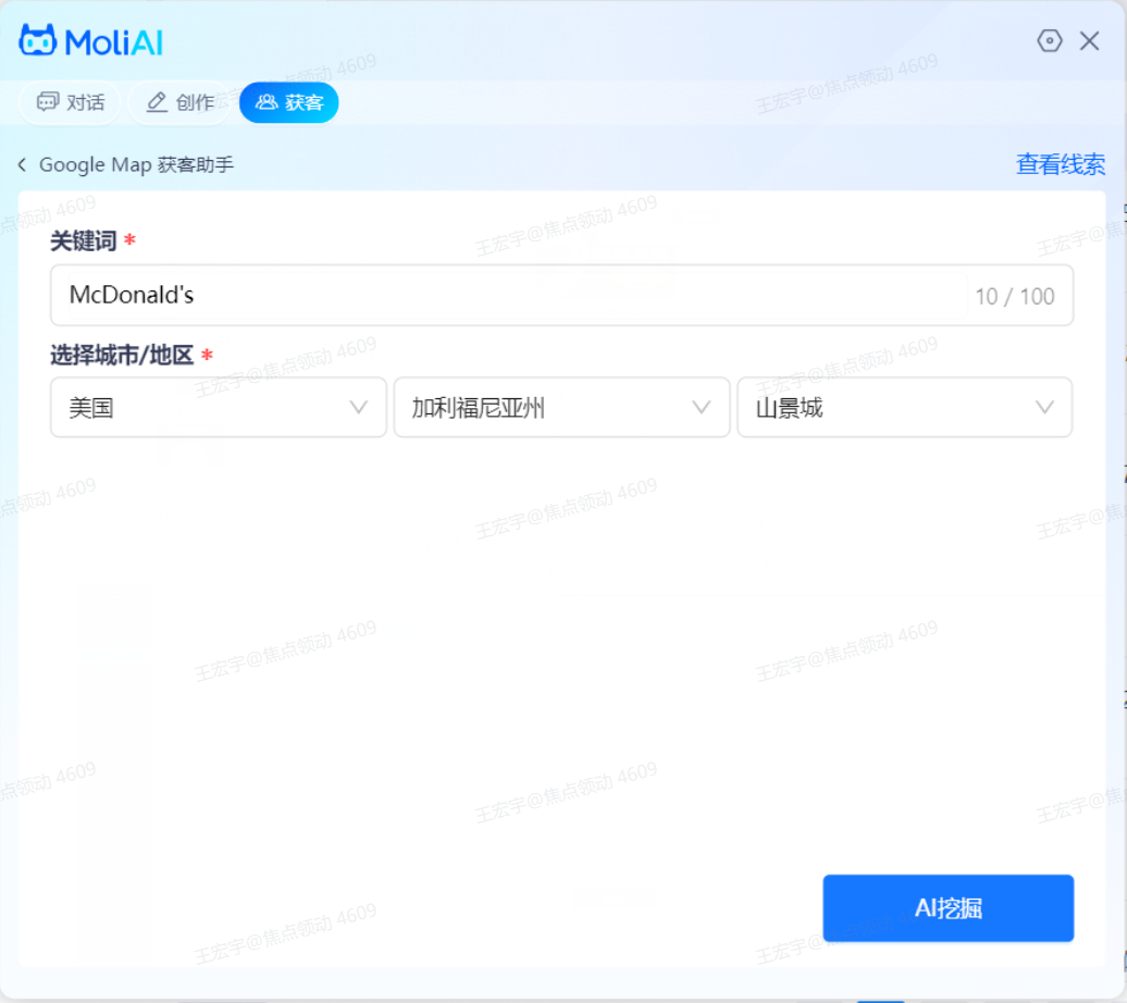 (3)使用地图获客助手(以Google Maps 获客助手为例),点击”Google Maps 获客助手“填写您需要获取的企业名称以及位置信息,如下图所示: