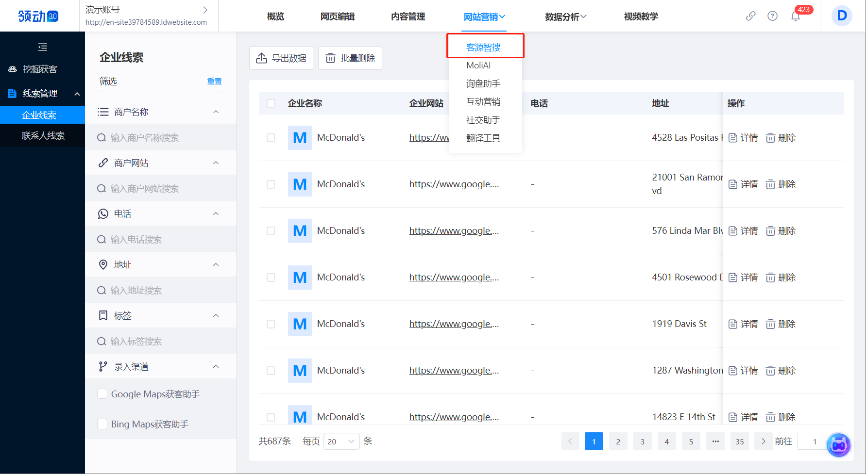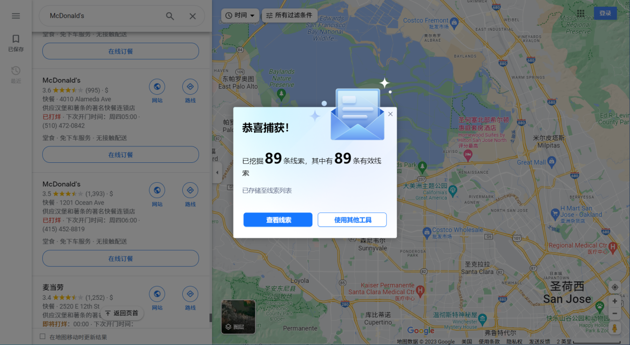 (11)企业线索页面为您整理收集了您使用Maps获客助手所挖掘成功的全部信息,如下图所示: