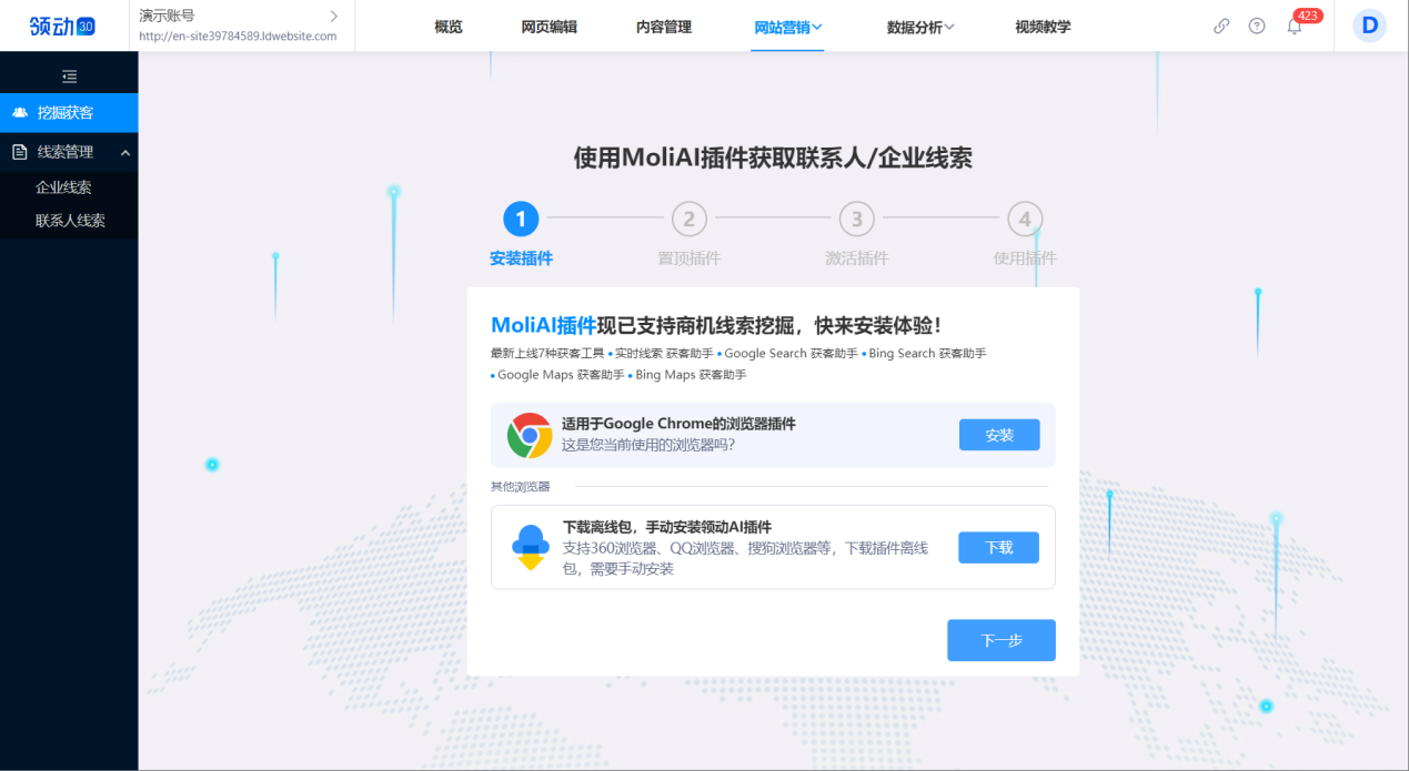 (10)挖掘获客页面为引导页面,为您提供插件的下载路径以及激活指导,如下图所示: