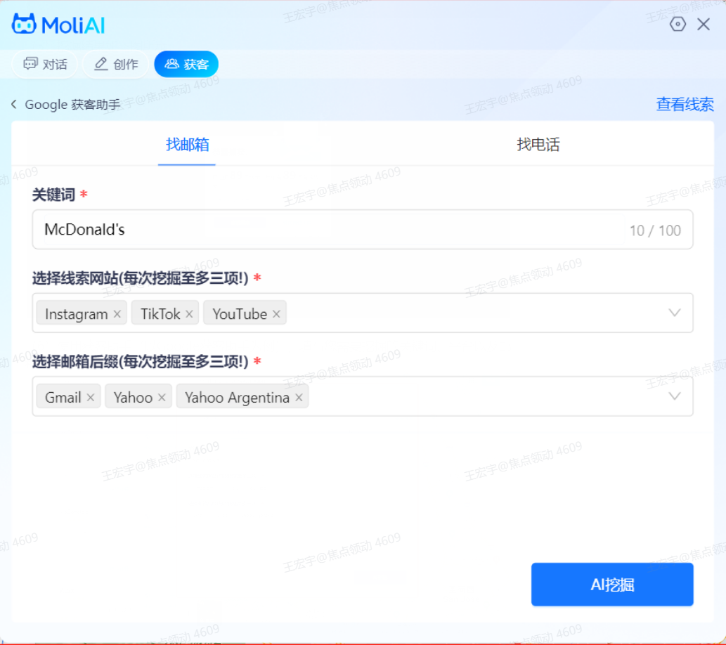 (6)使用获客助手(以Google获客助手为例),填写您需要挖掘的关键词、平台以及邮箱后缀,如下图所示: